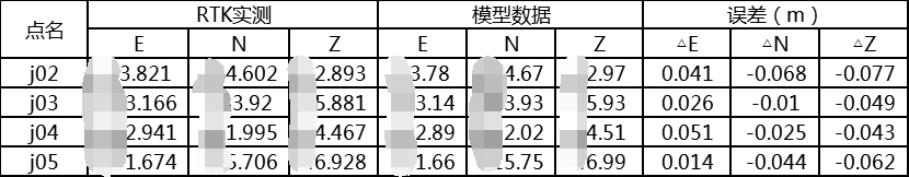 坐标系的模型成果。检查点4个,成果精度对比如下: